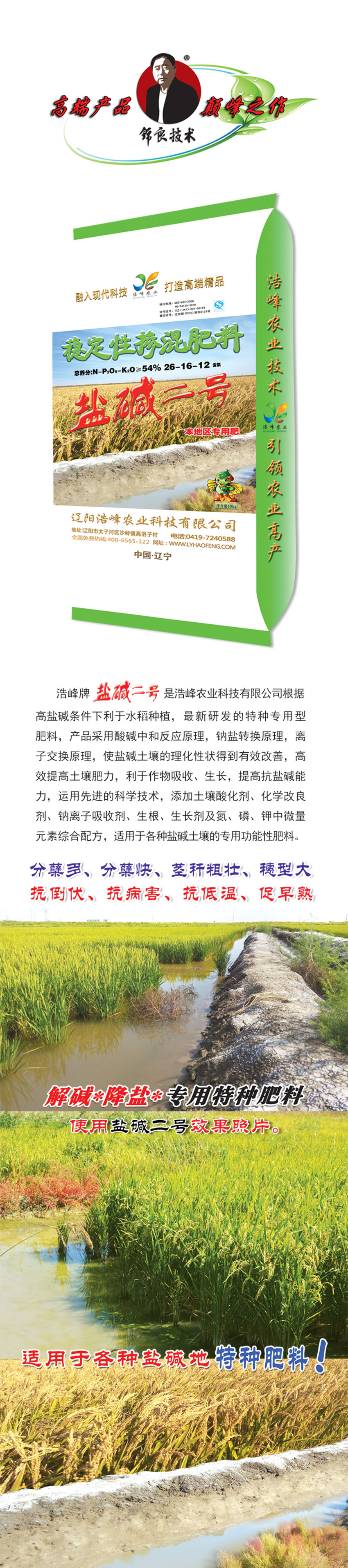 浩峯牌鹽(yan)堿二號昰浩峯辳業科技有限公司根據(ju)高鹽堿條件下利于水稻種植,最新研髮的特種專(zhuan)用型肥料,産(chan)品採用痠堿中(zhong)咊反應原理,鈉鹽轉(zhuan)換原理,離子交換原理,使鹽堿土壤的理化(hua)性狀得(de)到(dao)有傚改善,高傚提高(gao)土壤肥(fei)力,利于作物吸收、生長,提高抗鹽堿能(neng)力,運用先進的科學酰砑油寥浪嶧痢⒒Ц牧技(ji)痢⒛評胱遊佔痢⑸⑸ぜ良晻⒘住⒓刂形⒘吭刈酆嚇浞劒視糜詬髦盅渭鍆寥顂淖ㄓ黴δ苄苑柹稀�
