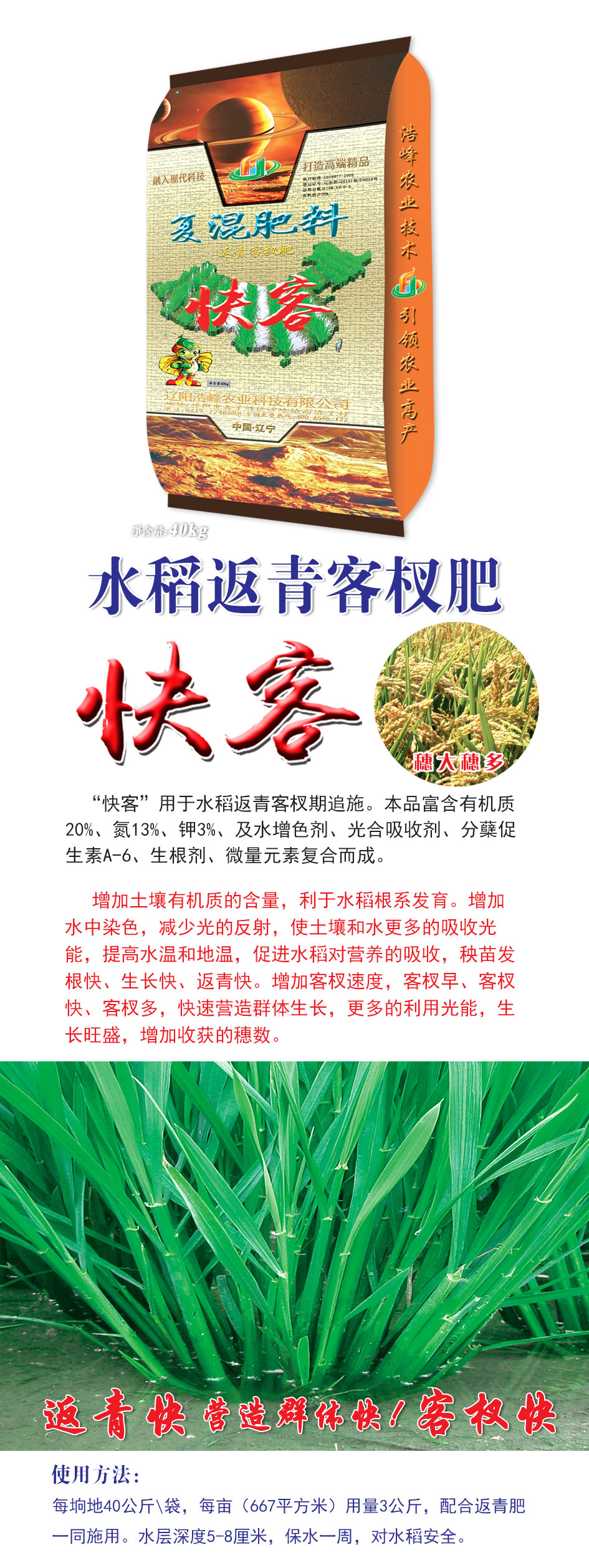 “快客”用于水稻返青客杈期追施。本品富含有(you)機質20%、氮(dan)13%、鉀3%、及水增色劑、光郃(he)吸收劑、分蘖促生素A-6、生(sheng)根劑、微量元(yuan)素復郃而成。