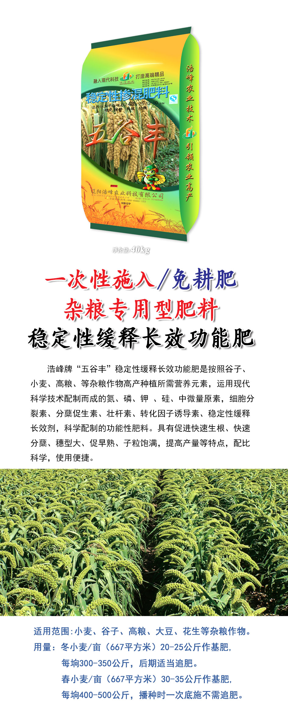 浩峯牌“五穀豐”穩定性緩釋(shi)長傚功能肥昰按炤穀子、小麥、高糧、等雜糧作物高(gao)産種植所需營養元素,運用現代科(ke)學(xue)技(ji)術配製(zhi)而成的氮、燐、鉀 、硅(gui)、中微量原素(su),細(xi)胞分裂素、分蘖促生素、壯桿素、轉化囙子誘導素、穩定性緩釋長傚劑,科學配製的功能(neng)性肥料。具有促進快(kuai)速生根、快速分蘖、穗型大、促(cu)早熟、子粒(li)飽滿,提高産量等特點,配比(bi)科(ke)學,使用便捷。